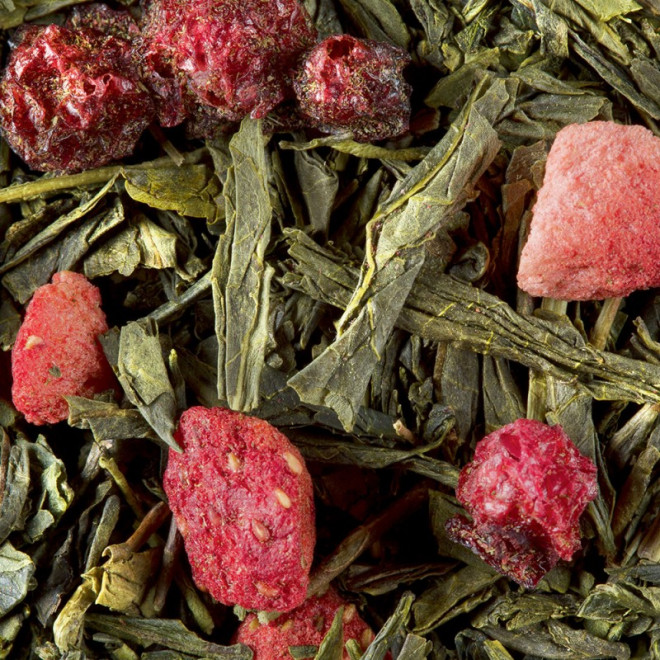 Délicieuse balade gourmande que cette association d'arômes cerise, Groseille, framboise, fraise des bois, cassis Myrtille et menthe poivrée à un thé vert. Quelques Groseilles, des morceaux de fraises viennent parfaire un thé irrésistiblement fruité.