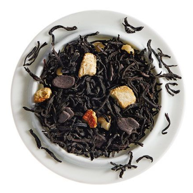 Pour tous les accros du chocolat ! Une partition très réussie, éclairée par les notes vives d’une orange amère. Thé noir gourmand aux notes dominantes de chocolat et d’amandes, pépites de chocolat noir, morceaux d’amandes et écorces d’orange