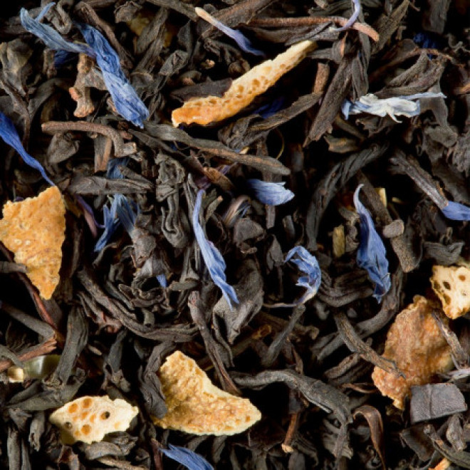 Mélange de thés noirs, arômes agrumes et épices de Noël (Cannelle, muscade, girofle), agrémenté d'écorces d'orange à servir sans conteste accompagné de petits gâteaux sablés.