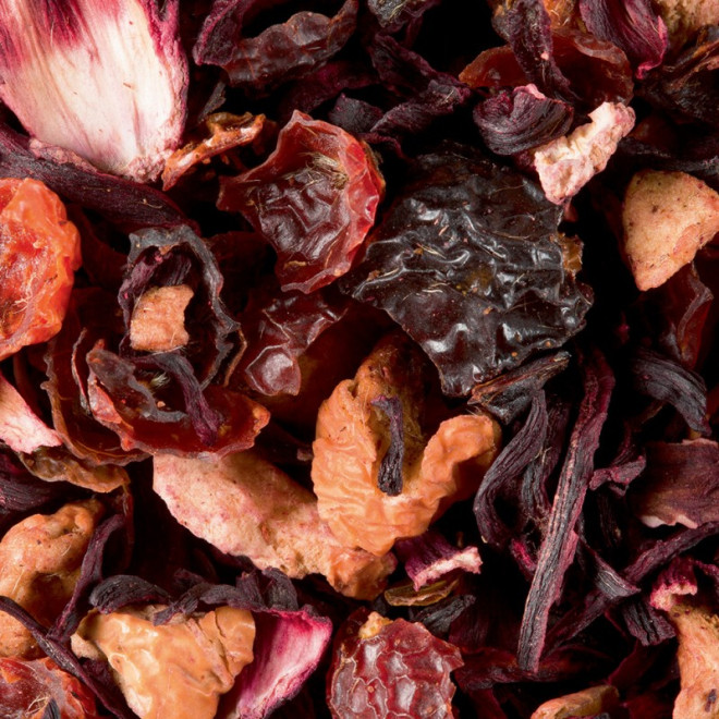 Mélange de fleurs d'hibiscus, de morceaux de pomme, d'écorces de cynorrhodon, arômes framboise, fraise et crème.