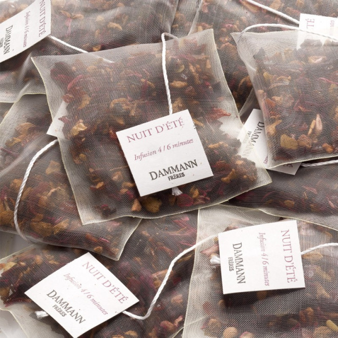 Mélange de fleurs d'hibiscus, de morceaux de pomme, d'écorces de cynorrhodon, arômes framboise, fraise et crème.