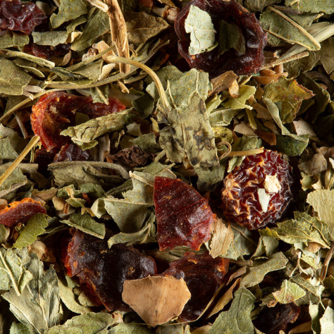 Agréable mélange d’écorces de cynorrhodon, de tilleul et de feuilles de cassis pour une infusion ronde et gourmande dans laquelle, les notes veloutées et sucrées de la poire et de la mirabelle se mêlent à celles plus rafraîchissantes de la rhubarbe et de la pomme verte. Délicieusement fruitée, une tisane qui évoque irrésistiblement l’atmosphère d’un verger le soir d’une journée de fin d’été lorsque les arbres gorgés de soleil, diffusent leurs parfums de fruits mûrs.