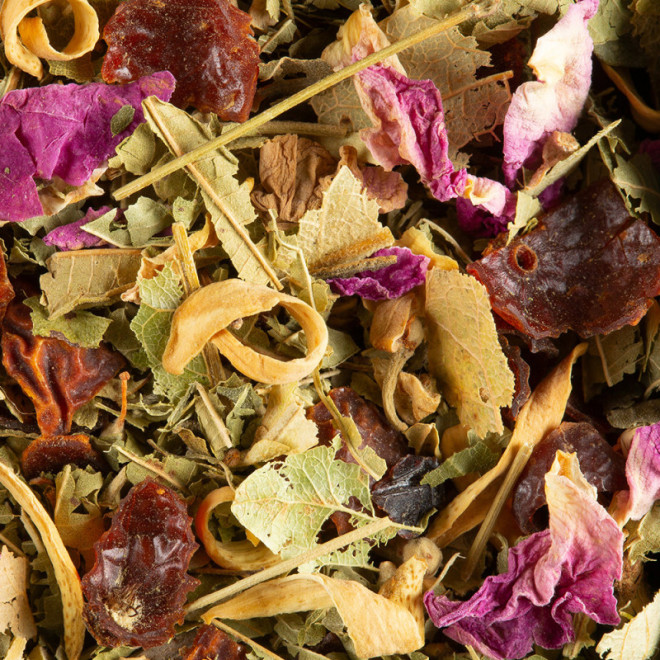 Bergamote, kiwi, pêche jaune, fleur d'oranger, fleur de violette, toutes ces senteurs et saveurs cultivées avec soin et gourmandise depuis le XVIIe siècle dans les jardins de Versailles. Ces saveurs associées à la verveine et au tilleul, nous offre une tisane agréablement parfumée où, notes végétales, fleuries et fruitées se mêlent dans une royale infusion.