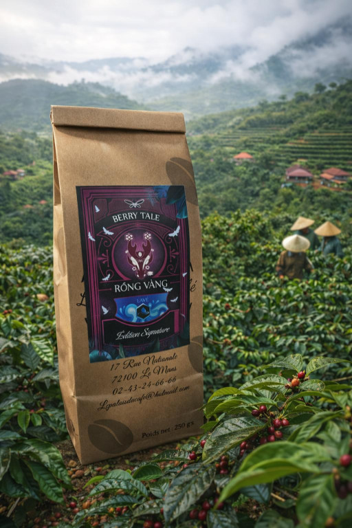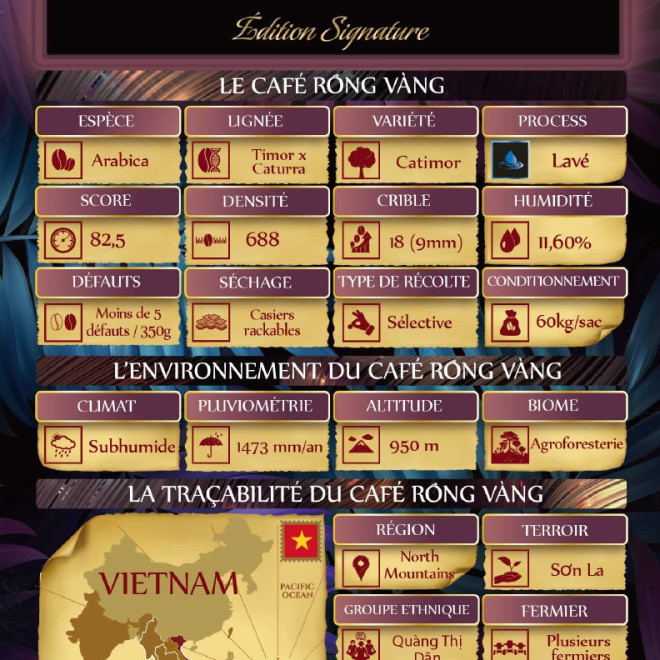Le Rong Vang signature, rare dragon d'or, symbolise la préciosité du café Arabica. Dans les montagnes de Son La et de Dalat, quelques tonnes seulement sont produites chaque année. Pour les fermiers vietnamiens, il représente une opportunité inestimable.
