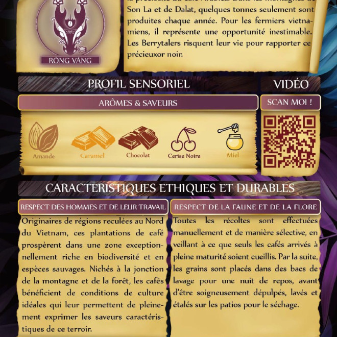 Originaires de régions reculées au Nord du Vietnam, ces plantations de café prospèrent dans une zone exceptionnellement riche en biodiversité et en espèces sauvages. Nichés à la jonction de la montagne et de la forêt, les cafés bénéficient de conditions de culture idéales qui leur permettent de pleinement exprimer les saveurs caractéristiques de ce terroir.